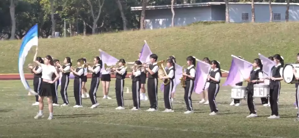 崇德國中行進管樂隊除了管樂吹奏,還配置了「樂旗隊」作為行進表演中的視覺隊伍,拋旗、舞旗、隊形與身段皆為重要訓練項目,以國內頂尖同類隊伍為標竿。比賽結合管樂吹奏與樂旗隊動態呈現,展現音樂與視覺整合的舞台效果。\